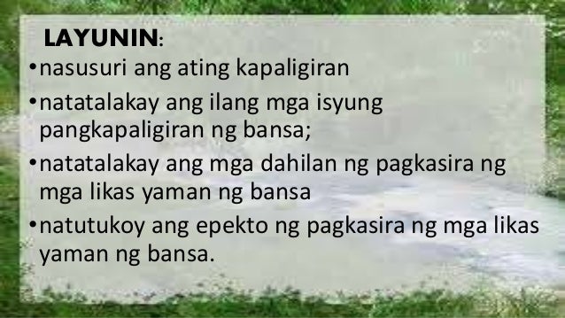 Ang paksa nito ay tungkol sa pagkasira ng ating kalikasan na may napakalaking epekto sa ating kinabukasan BSimbolo 1simbolo ng bagay na nabanggit sa akda Ang kalikasan ay tulad ng isang kayamanan na iniingatan natin. Ang hindi natin maayos na pagtatapon ng basura lalo na ng plastic at iba pang hindi nabubulok ay pwedeng maging dahilan ng mga pagbaha pagdumi ng ating mga ilog dagat at iba pang anyo ng tubig at polusyon. Sinusunog ang mga kagubatan.