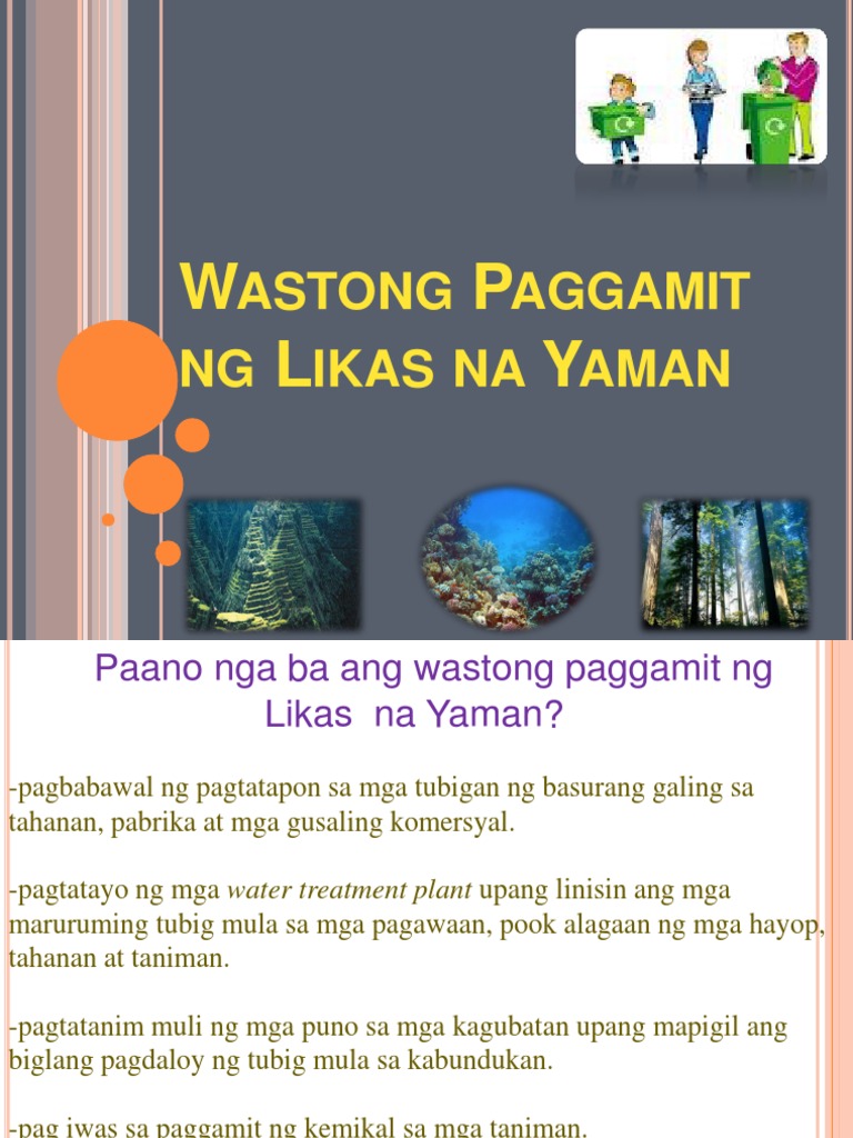 Malawak mayaman malinis at maganda ang tawag sa dagat natin noon. A Wastong Paggamit ng Likas na Yaman b Hindi Wastong Paggamit ng Likas na Yaman 13 Sa kagustuhan ni anna na makatulong sa pangangalaga ng kalikasan siya ay nagtatanim ng mga puno sa kanilang bakuran a Wastong Paggamit ng Likas na Yaman b Hindi Wastong Paggamit ng Likas na Yaman 14 Upang maiwasan ang pagbaha itinatapon ni ben ang basura. At maging ang mga dahilan at bunga ng pagkasira ng kalikasan.